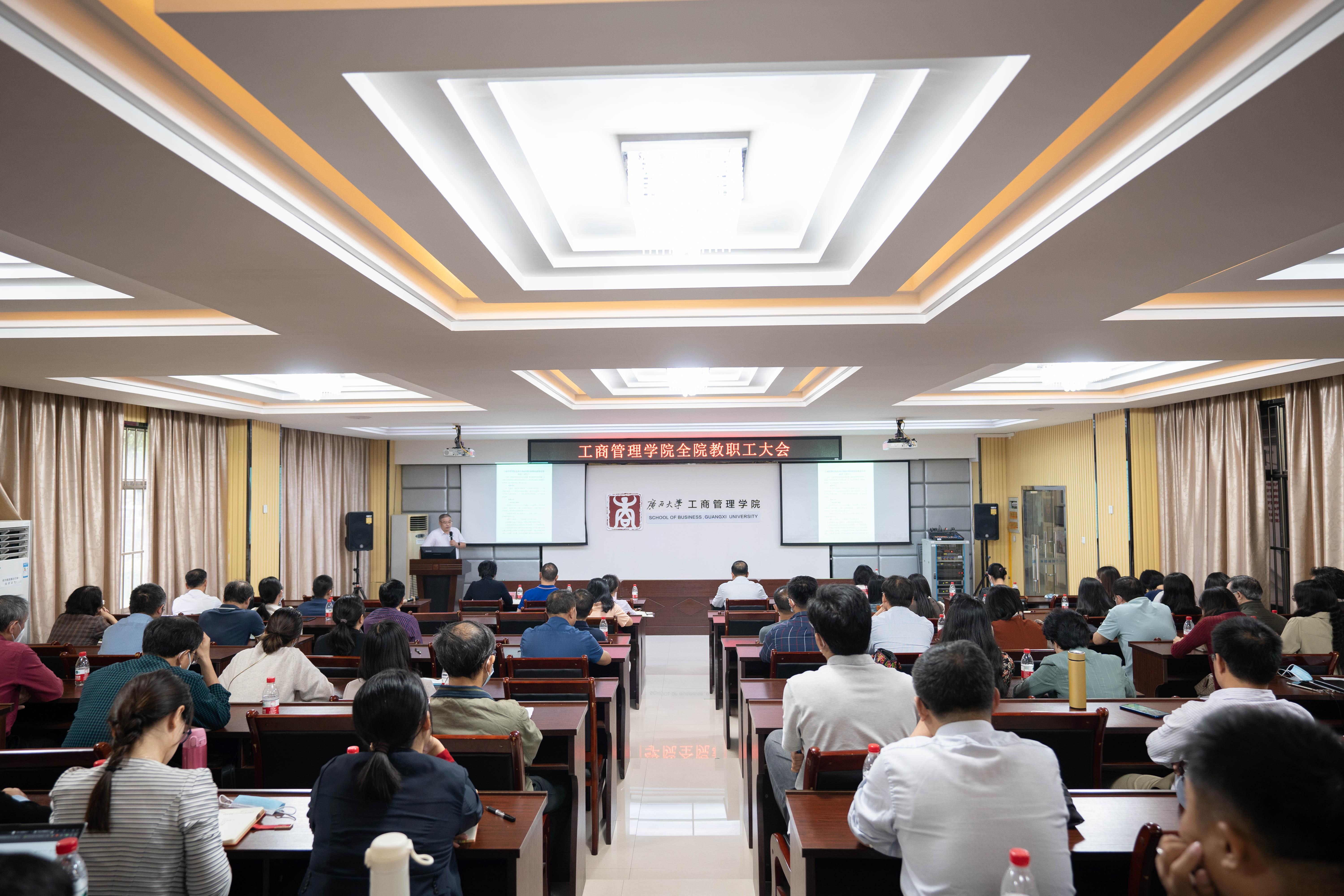 院长朱帮助就学院近期出台的高水平科研团队和科研成果培育办法进行了介绍和解读。他指出,学院出台该办法旨在进一步营造学院良好的科研氛围,加快高水平科研团队建设和科研成果产出,全院教职工要敢于争先,精诚团结打造高水平科研团队,营造浓厚科研氛围,培育高水平科研成果,以科研反哺教学,提高学院教学、科研和人才培养水平。他强调,为激发教师的教学科研热情,学院为每一位老师搭建好教学科研平台,做好服务工作,希望全体教职工高度重视,积极融入国家重要战略和广西经济社会发展大局,加强沟通和研究,把教学科研工作抓起来、干起来,落实落地,切实提高教学科研能力与水平,为学院立德树人、学科建设和高质量发展提供有力支撑。