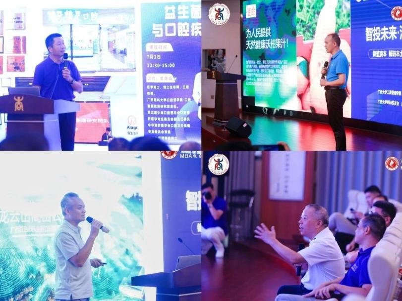 论坛还设置校友企业路演环节。广西爱生多维长寿口腔科技有限公司、广西龙云山茶叶集团有限公司、广西冰客果汁有限公司分别展示口腔健康科技、有机茶产业升级与沃柑深加工项目,龙晓荣逐一进行专业点评与发展建议。