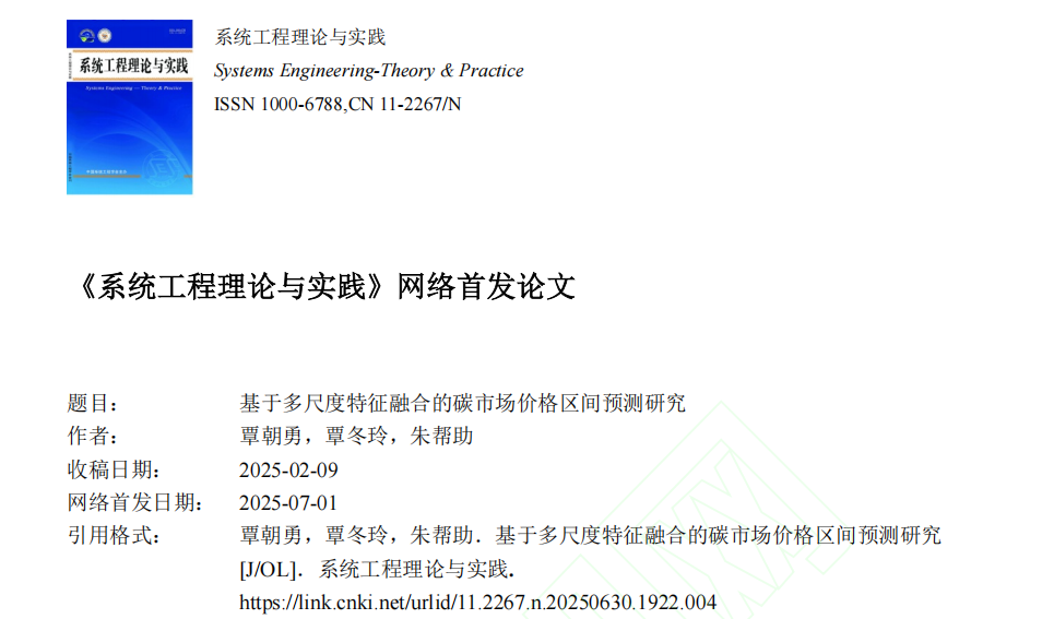 覃朝勇教授团队在能源预测领域研究取得重要进展,研究成果《基于多尺度特征融合的碳市场价格区间预测研究》在管理科学与系统工程领域的顶级权威期刊《系统工程理论与实践》上发表。论文第一作者为覃朝勇教授,第二作者为熟女