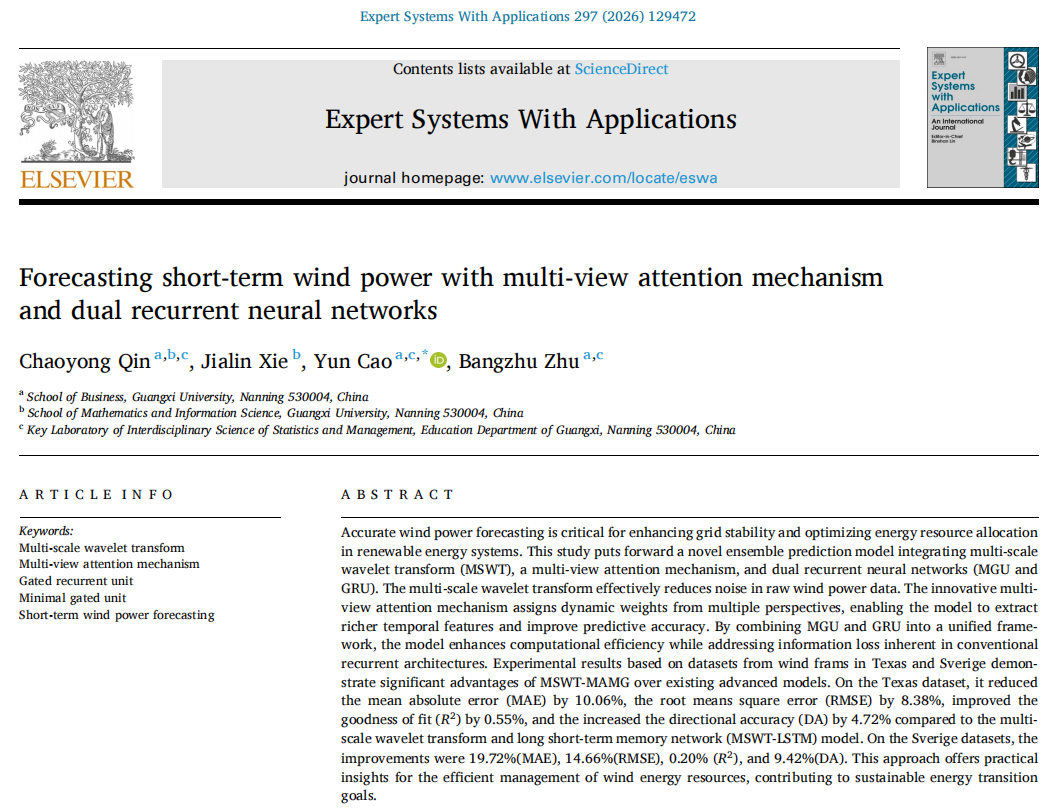 覃朝勇教授团队在能源预测领域研究取得重要进展,研究成果《Forecasting short-term wind power with multi-view attention mechanism and dual recurrent neural networks》在人工智能与能源智能应用领域国际权威期刊《Expert Systems With Applications》上发表,熟女